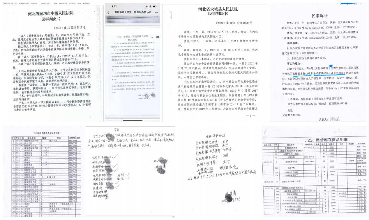 路女士提供的相关材料显示:于某在廊坊市中级人民法院审理的(2020)冀10民终3812号案件当中的2020年9月10日的开庭笔录中陈述:“路某思转账分三笔共85万,此款系给付16、17年家具款,路某倩将被上诉人(于某、于某元)家具出售才有了此笔款项,当时路某思是路某倩会计”并提供了与于某在另案虚假诉讼的案件中提交的一致的5份家具保管协议,该5份家具保管协议上所载明的家具,是于某虚假诉讼的案件中的家具。上述家具被大城县人民法院、大城县公安局,在已办理的执行案件和虚假诉讼案件中在犯罪嫌疑人于某、于某元的经营地点起获作为物证。路女士认为,从最简单的道理来看,于某、于某元两起诉讼案中,这5份保管协议涉及的家具作为同一诉讼标的物反复出现,说法自相矛盾,也至少有一个说法是假的。